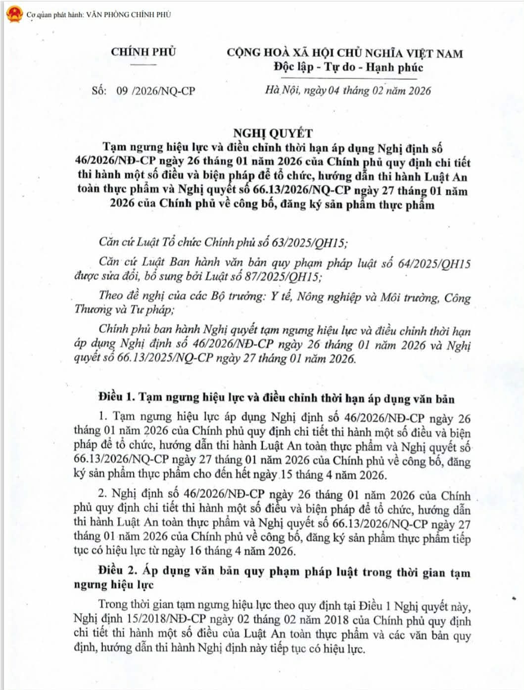(Chinhphu.vn) - Chính phủ vừa ban hành Nghị quyết số 09/2026/NQ-CP về việc tạm ngưng hiệu lực và điều chỉnh thời hạn áp dụng Nghị định số 46/2026/NĐ-CP ngày 26/01/2026 quy định chi tiết thi hành một số điều và biện pháp để tổ chức, hướng dẫn thi hành Luật An toàn thực phẩm và Nghị quyết số 66.13/2026/NQ-CP ngày 27/01/2026 quy định về công bố, đăng ký sản phẩm thực phẩm.