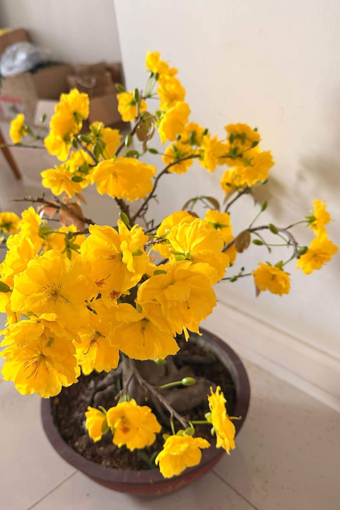 Con trai gửi cho tấm hình cây mai bonsai bung nở tối đa với lời rủ: nay mùng 8 mình đi ăn trưa, mừng cây mai nở thiệt đi mẹ. Nở thiệt? Quả thực khi tặng con cây mai bonsai này tôi nói với con là tôi có hơi lo lo. Vì mình mua cây mai nhanh quá, không xem thật kỹ, càng không trả giá gì hết.