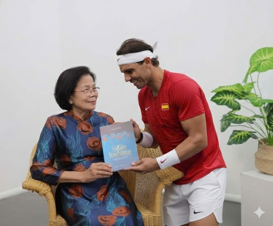Tưởng sao, sáng nay Kim Anh gửi tặng mình bức hình nàng tự ghép, nói là, thôi không động tới hình anh Kiến Phước làm chi, ghép hình chị tặng Nadal cuốn "Sài Gòn bao thương" coi ngộ lắm, hài lắm, cho chị… đỡ buồn.