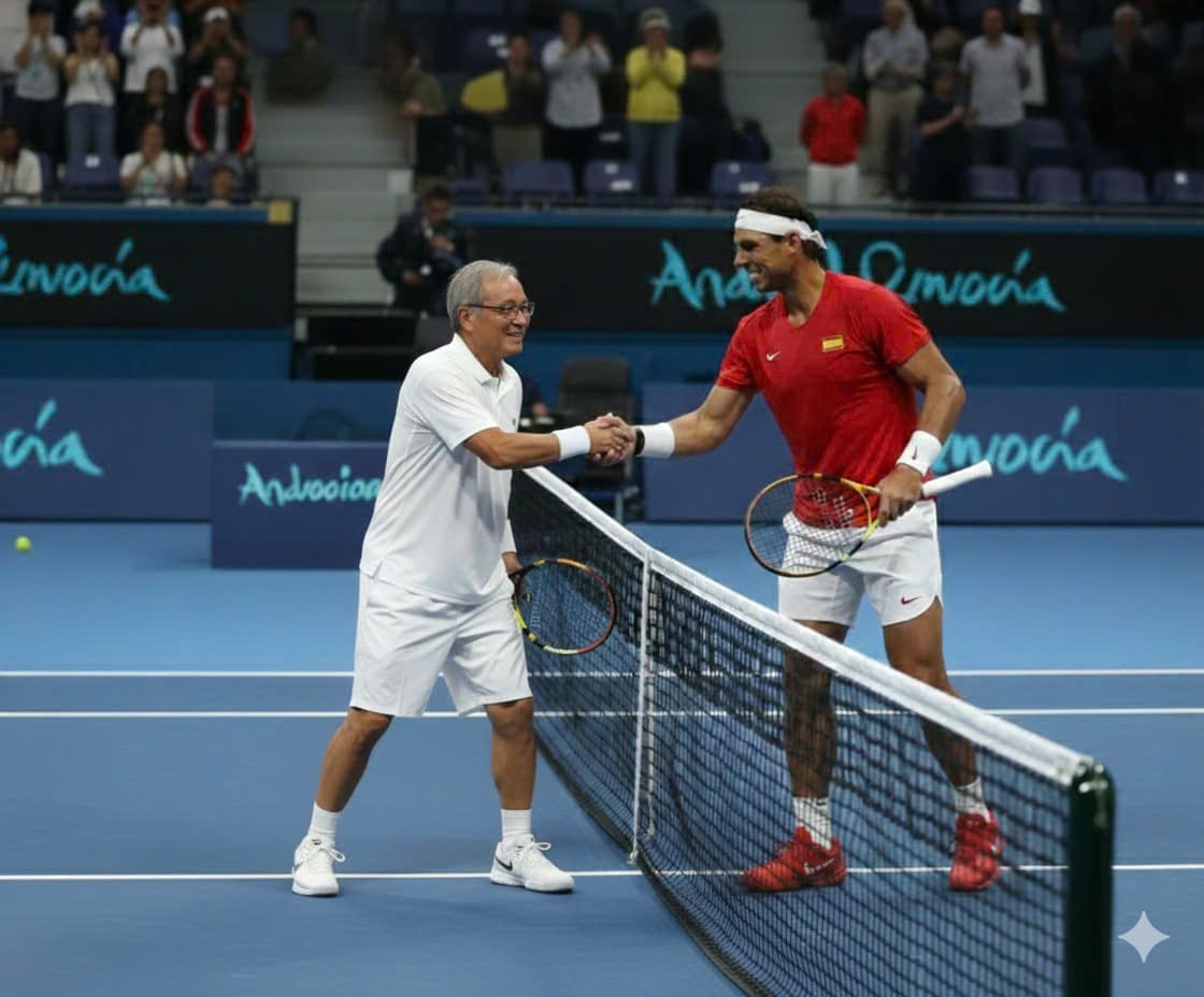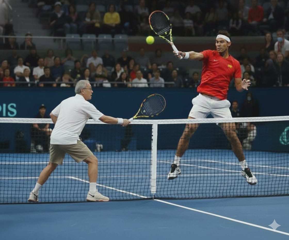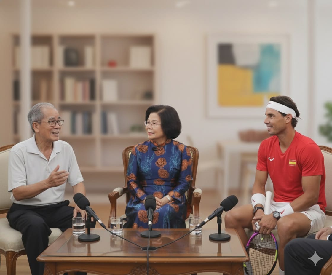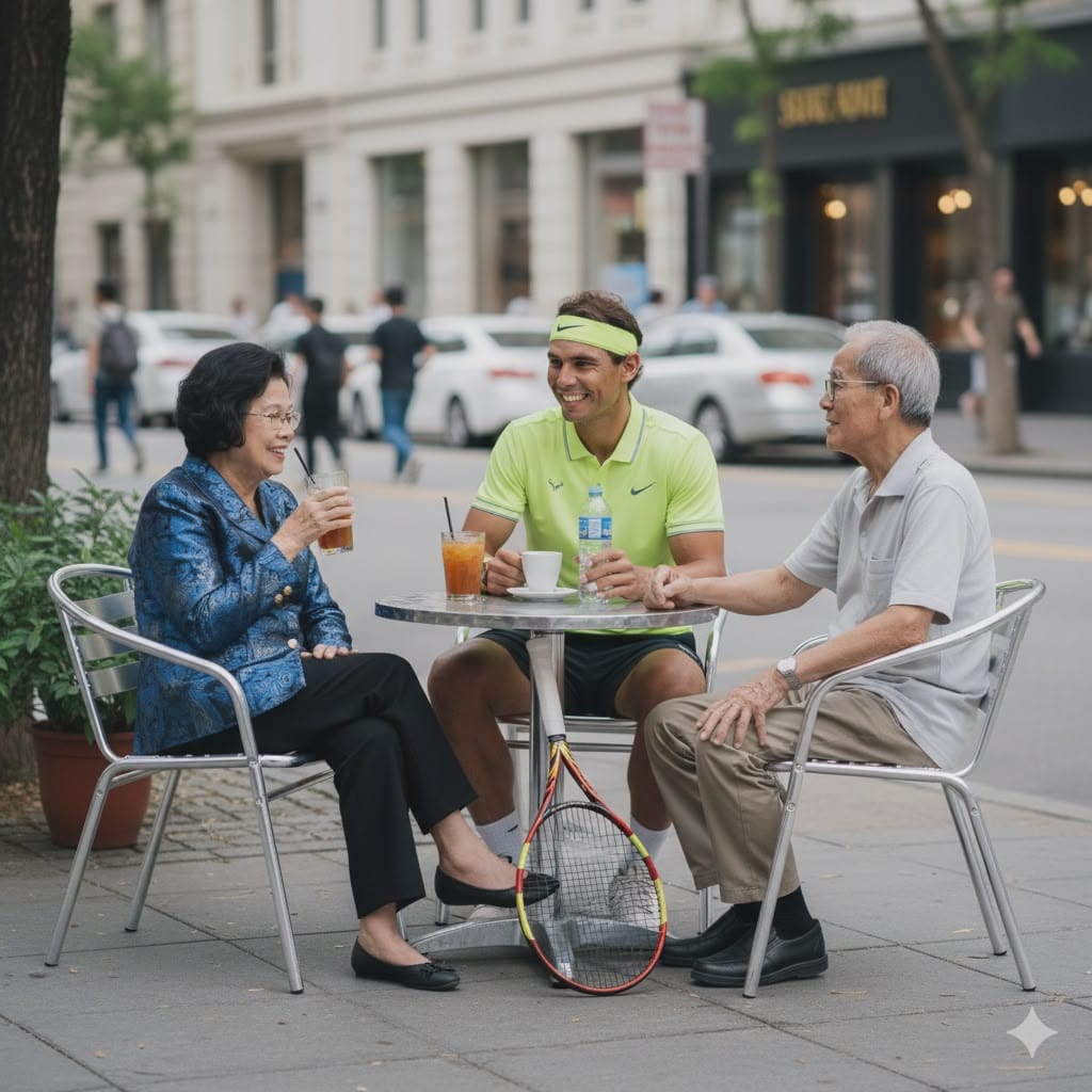 Vậy mình "ứng tác" như sau. Sáng chuá nhật, Nadal mời hai tụi mình đến thư phòng nói chuyện kỹ thuật thi đấu. Rồi Nadal khuyến khích "bạn cùng nhà" của mình ra sân đấu giao hữu. Sau vài ván thua suýt sấp mặt, ba tụi mình kéo nhau ra cafe vỉa hè...