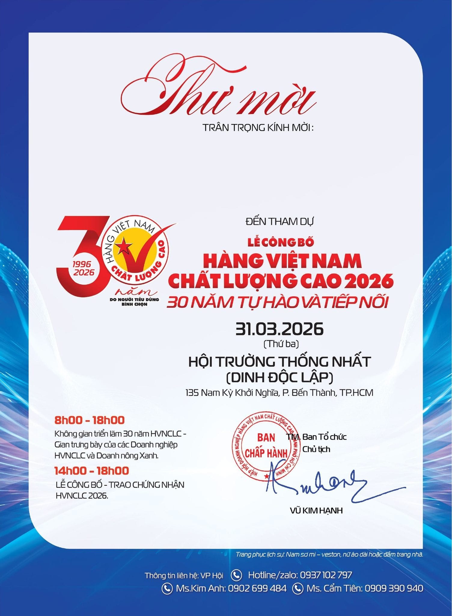Chiều nay từ 14g là LỄ CÔNG BỐ, phiên chính. Một vị lãnh đạo Ủy ban nhân dân TP phát biểu. Nghe đâu còn có một tiết mục bất ngờ từ một vị khách Hà Nội thân thiết nhất với doanh nghiệp HVNCLC và khởi nghiệp. Tôi được cho 10 phút để kể chuyện 30 năm, mà chỉ được có 10 phút. Và sẽ có 2 doanh nghiệp, một là doanh nghiệp xuất sắc có mặt đời đầu, 30 năm trước và một bạn vừa đạt danh hiệu HVNCLC vốn là doanh nghiệp trẻ mới Khởi nghiệp, đã doạt giải cuộc thi Khởi nghiệp Xanh 2 năm trước, nay vừa lọt vào sổ hồng của người tiêu dùng. Còn lại, thời gian quí báu là dành cho các doanh nghiệp vui nhất hôm nay.