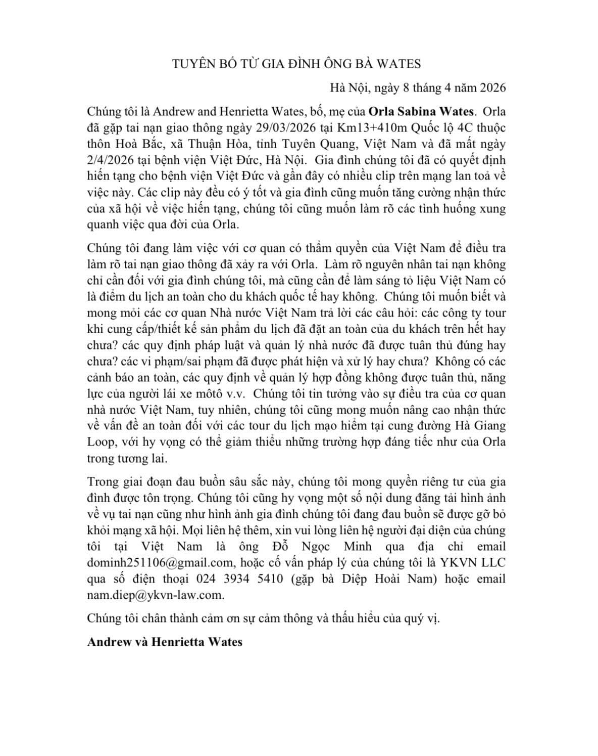 Cuối cùng trước khi mang tro cốt của con gái về Anh, gia đình người Anh này đã để lại một bức thư. Mời bạn đọc điều họ mong muốn: họ yêu cầu được tôn trọng sự riêng tư trong những giờ phút đau buồn nhất của gia đình, hy vọng mọi người bớt chia sẻ những hình ảnh đau lòng. Đồng thời họ cũng mong muốn các cơ quan chức năng tiến hành thanh kiểm tra các tour du lịch mạo hiểm ở Hà Giang và có những biện pháp chế tài phù hợp để giảm thiểu những tai nạn tương tự trong tương lai.