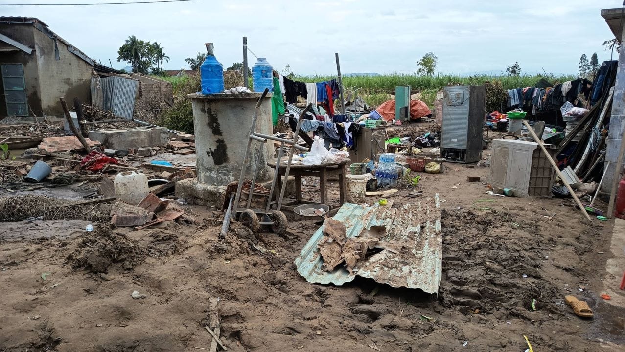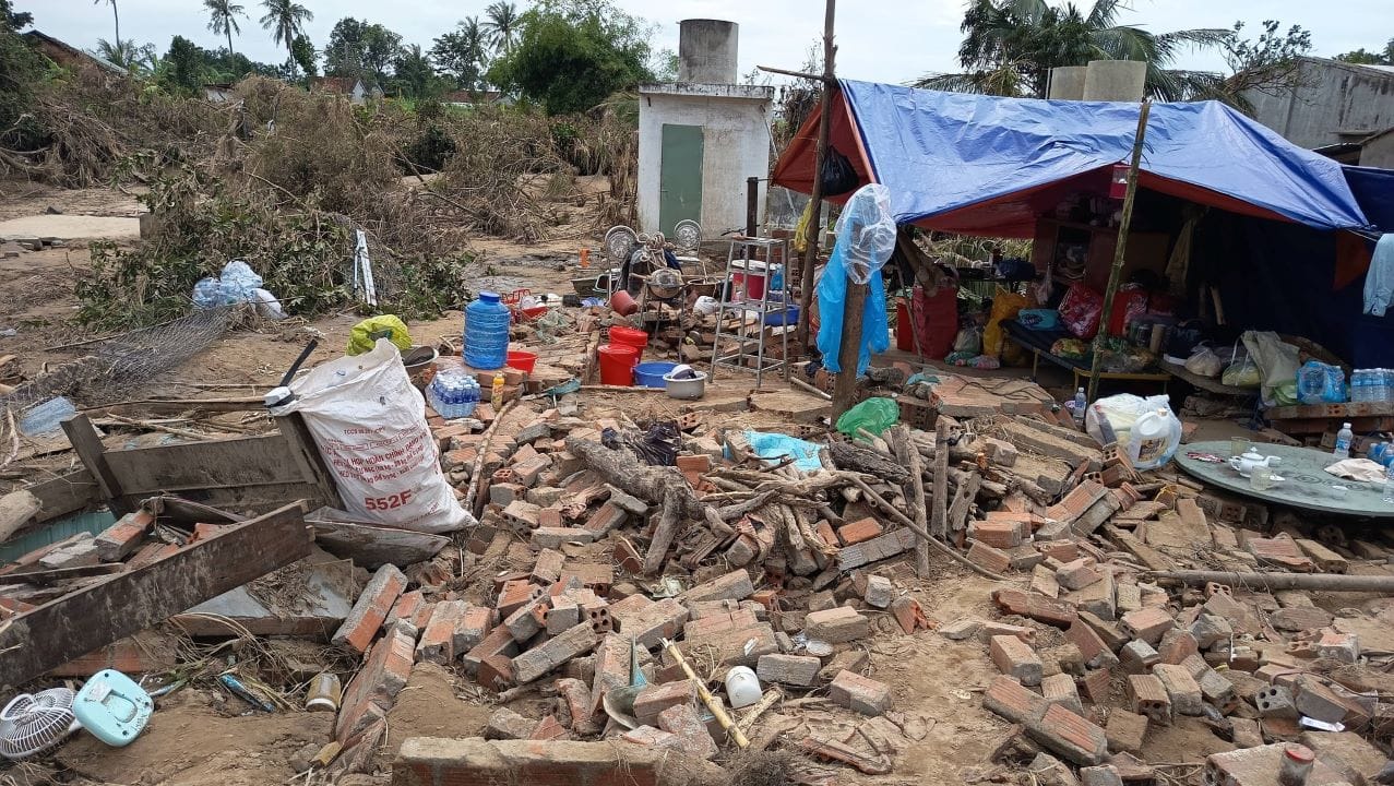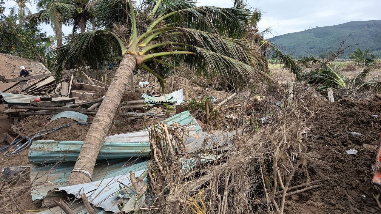 Những ngôi nhà tường gạch chỉ còn móng. Vật dụng bị trôi, lấp, vài thứ còn lại thì treo lẫn trong tán dừa, ngọn mít. Cây gãy, mái tôn xoắn lại như bánh tráng nhúng nước. Có căn nhà chỉ còn vài viên ngói vỡ để nhận diện. Người dân đứng bên nền nhà của chính mình mà không biết nên bắt đầu từ đâu.