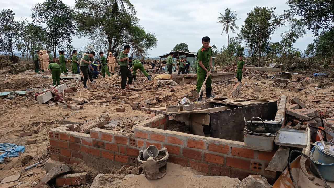 Cùng thời điểm, lực lượng quân đội, công an... từ các tỉnh đã có mặt. Họ chia thành nhiều nhóm, dọn đất đá, khôi phục lại những lối đi, giúp người dân mót lại viên gạch, viên ngói, vật dụng còn sót trong bùn. Nhiều đoàn cứu trợ khác cũng đang lần lượt vào thôn.
