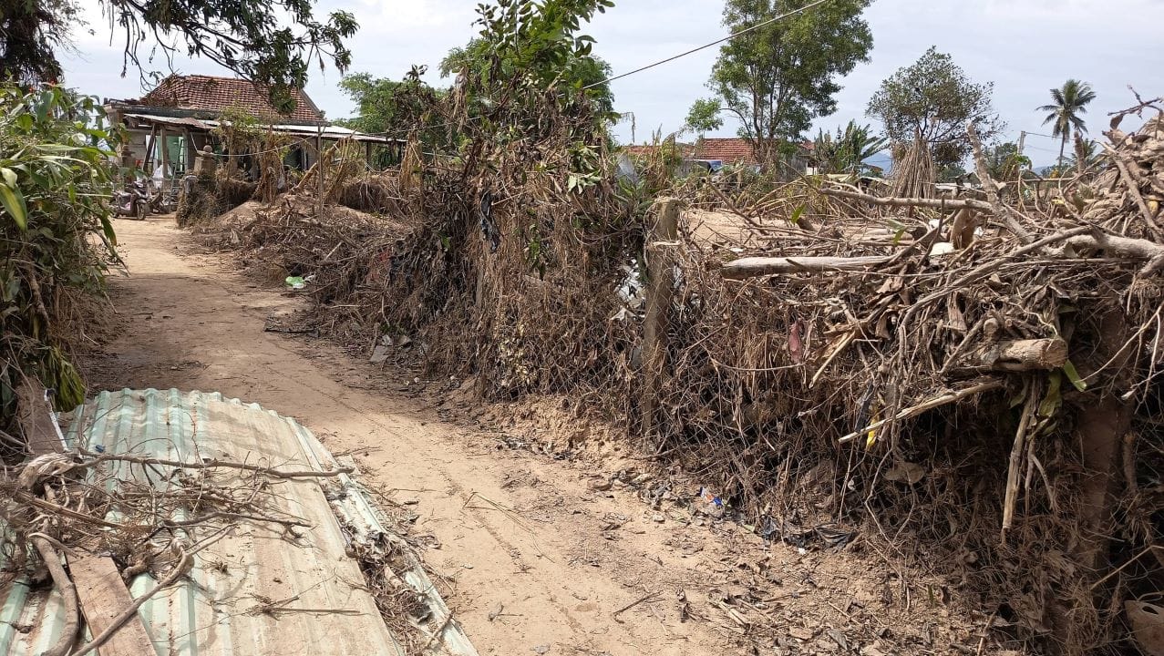 Dọc đường vào xóm, những thân dừa bị quật ngã nằm chắn ngang lối. Nhiều mảnh tôn cong queo kẹt trên những nhánh cây cao. Dấu hiệu cho thấy dòng nước hôm ấy khủng khiếp đến mức nào.