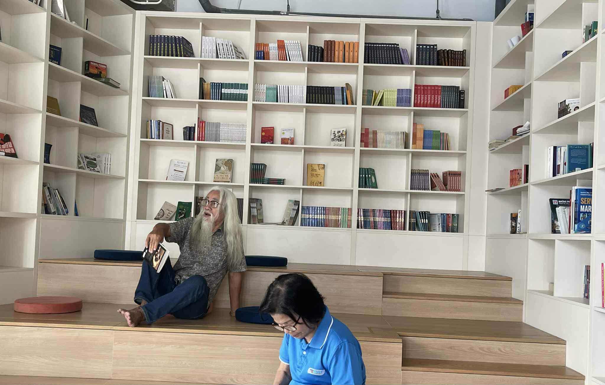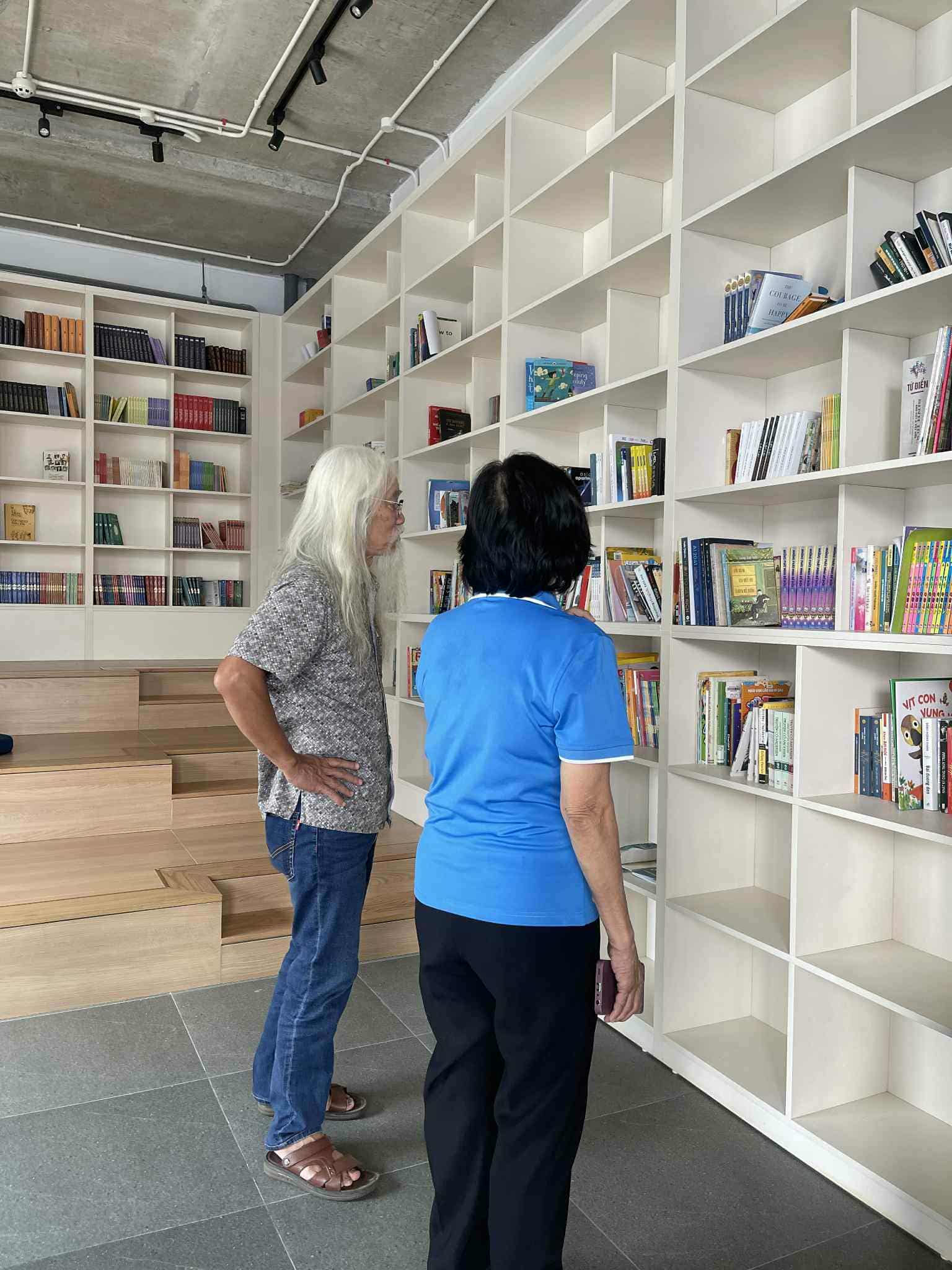 Tôi yêu mùi gỗ và mùi sách của cái thư viện thật là đẹp và... sạch như ly như lau đến nỗi phải tuột giày ra và (muốn) ngồi bệt ngay dưới sàn nhà, với tay thật nhẹ, cầm lên một quyển sách. Ngoài 3 tầng lầu dành cho thư viện, cả một tầng 2 của khu kế cận còn được tổ chức nhiều phòng đọc chuyên đề. Anh Quyền hóm hỉnh: cả trường này mênh mông, ban ngày không nơi nào mở máy lạnh chỉ có thư viện là có điều hòa nha chị. Biết rồi thầy Quyền ơi, tụi nhỏ bị hút vào đây, rồi bị đặt sách vào tay bởi cách trưng bày và cả giải thưởng hàng tuần nữa…