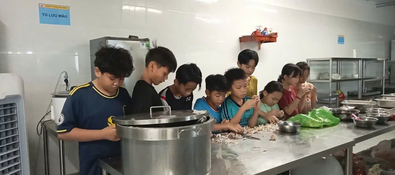Từ khi trường chuyển về cơ sở mới, tụi nhỏ bỗng thích xuống bếp: giành nhau lặt rau, gọt củ, nấu cơm, ríu rít, lăng xăng. Các chị bếp, mới đầu cũng quạu vì chúng bày đủ thứ ra không dọn, làm đậu hủ bị bể, rau bị vụn nhưng tụi nhỏ nhe răng cười, vuốt vuốt lưng là mấy dì cũng phì cười. Mấy đứa còn xin cô T có căn nhà gỗ gần trường giao nhà cho chúng xúm nhau nấu cơm bằng củi, phùng mang chu miệng nhúm lửa, thổi khói bay tứ tung, cùng chờ cơm sôi bốc khói thơm lừng rủ nhau hít lấy hít để, gọi là mùi khói với mùi cơm mẹ nấu. Rồi mỗi nhóm tự bày ra nấu một món ngon nhất của tỉnh mình, đấu nhau xem món của tỉnh nào ngon hơn. Có hôm nhà bếp chiêu đãi món bánh xèo (mua vỏ bánh ở siêu thị mới đãi nổi gần 400 người cùng lúc) vậy mà ăn xong, một “chuyên gia” nhí len lén phân tích: ăn “bánh xèo công nghiệp” thấy lạt không, cái nào như cái nấy, không mùi không vị gì trơn. Chuyên gia khác đế thêm: thiếu mùi tay người, hồi má mình đổ bánh xèo đâu có trăm cái một mùi một vị, ngán quá.